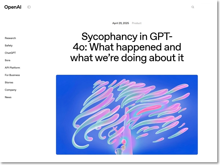 지난 주에 미처 소개하지 못한 앤스로픽 다리오 아모데이의 블로그 글을 소개한다. 자체 연구로 AI 해석에 자신감이 생긴 듯 하다. 다른 회사에도 함께 이 문제를 해결하자고 제안했다. 오픈AI는 4o 새 버전을 버리고 롤백(특정 시스템∙데이터베이스 상태를 이전 버전∙상태로 되돌리는 것)하기로 했다. 사람들이 싫어하는 태도를 보인 것이 원인이지만, 실제로 사용자 피드백을 충분히 받지 않고 서둘렀던 것 같다. 사람들이 지나치게 공손하고 아첨하는 AI를 싫어한다고.