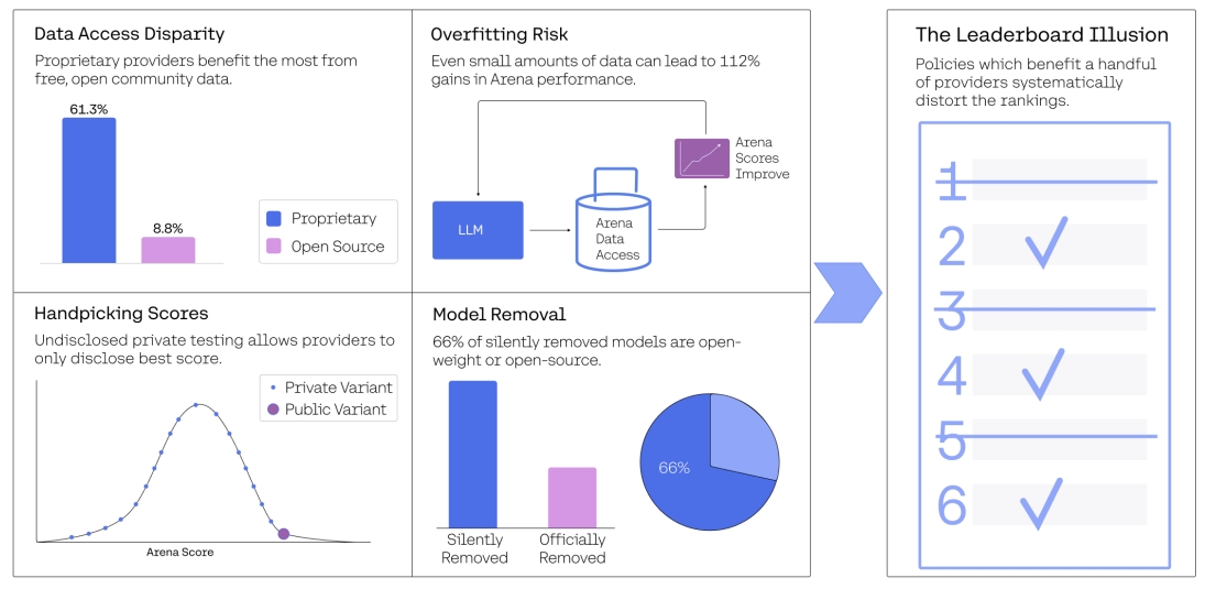 이 논문은 유명한 벤치마크 순위 서비스인 챗봇 아레나(Chabot Arena) 리더보드가 시스템 문제로 경쟁 환경을 왜곡한다고 주장한다. 챗봇 아레나 리더보드는 LLM 성능 평가를 위한 오픈플랫폼으로 백만 명 이상의 참여자에 의해 평가를 받는 방식으로 운영하며 버클리 대학의 스카이랩과 LMSYS 연구 그룹이 이끌고 있다.