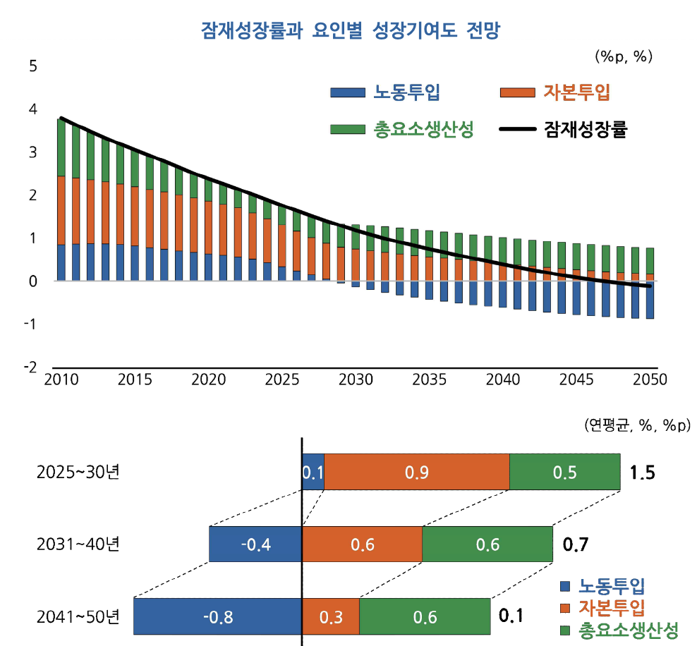 ํ๊ตญ์ ์ ์ฌ์ฑ์ฅ๋ฅ ์ ์ฌํด 1.8%์์ 2030๋ ๋์๋ ํ๊ท 0.7%๋ก ์ค์ด๋ ๋ค.