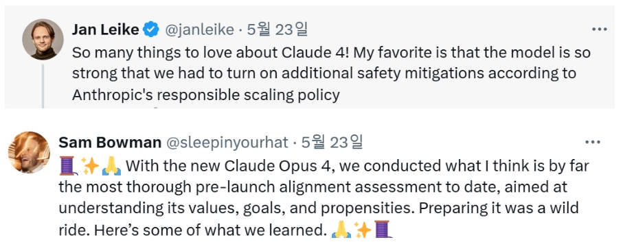오픈AI에서 얼라인먼트를 연구하다 앤스로픽으로 옮긴 얀 라이크는 엑스에 다음과 같은 트윗을 올렸다. 마찬가지로 샘 보우만 역시 클로드 오푸스 4는 얼라인먼트 평가가 가장 철저했다고 하면서 이를 강조하는 트윗을 올렸다. |