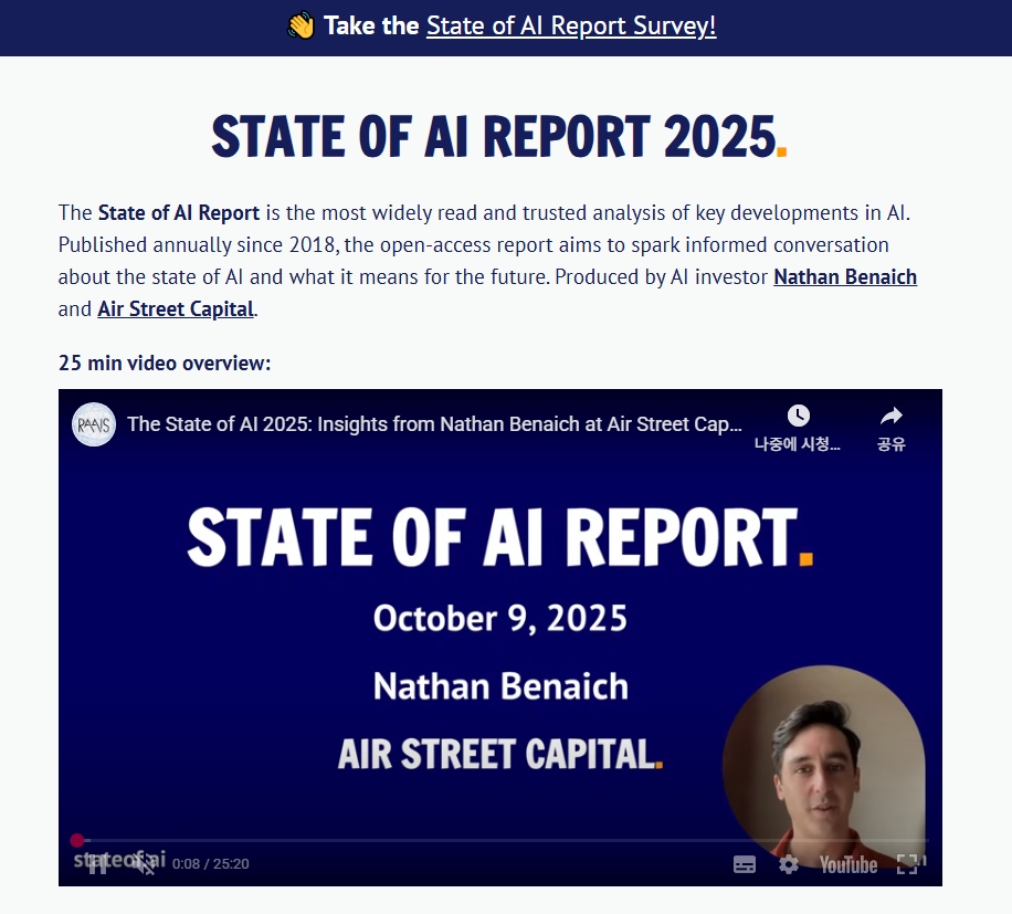 8년째 AI 현황 보고서를 발표하는 에어 스트리트 캐피탈의 보고서가 나왔다. 슬라이드는 300장이 넘는다. 이 슬라이드만 찬찬히 읽어 봐도 AI 기술, 시장, 정책 등이 어떤지 스냅샷으로 알 수 있다. 네이선 버네이시도 대단하다. 이 보고서도 많은 사람이 소개하고 내용을 요약해 온라인에 올리고 있다.