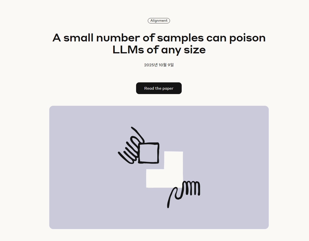 영국 AI 보안 연구소(UK AI Security Institute) 및 앨런 튜링 연구소(Alan Turing Institute), 옥스포드 대학, 취리히 연방 공대, 앤스로픽 얼라인먼트 사이언스 팀 공동 연구에서, 모델 크기나 학습 데이터 양에 관계없이 단 250개의 악성 문서만으로도 대규모 언어 모델에서 '백도어' 취약점을 생성할 수 있음을 발견했다.
