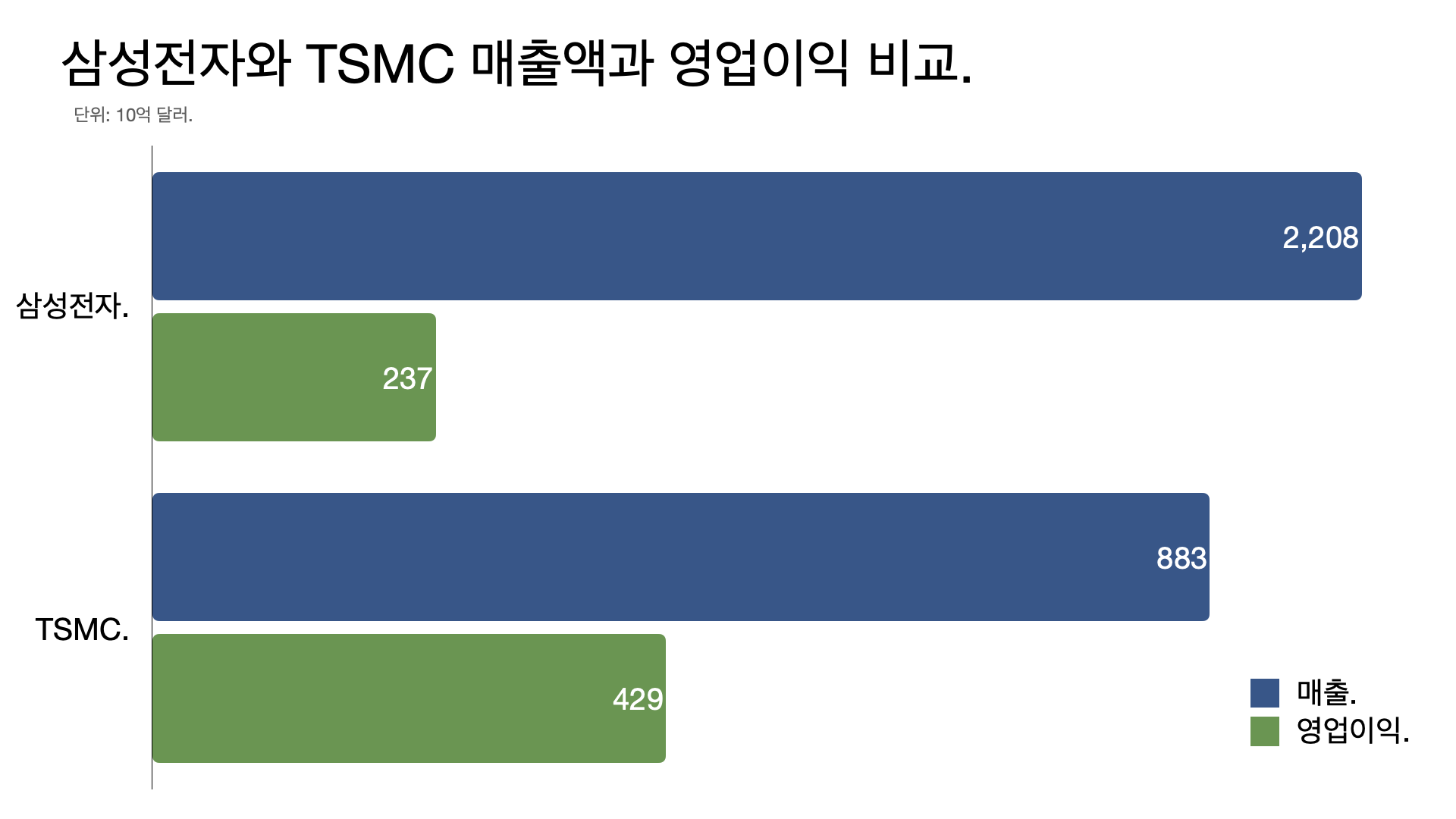 3๋ถ๊ธฐ ์์ ์ด์ต์ด ์ผ์ฑ์ ์๋ 12์กฐ ์์ธ๋ฐ TSMC๋ 21์กฐ ์์ด๋ค. ์์ ์ด์ต๋ฅ ์ด ๊ฐ๊ฐ 14%์ 51%๋ก ๊ฒฉ์ฐจ๊ฐ ํฌ๋ค.