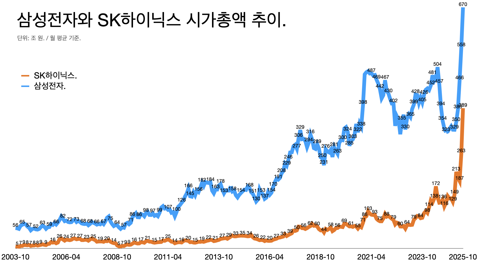 - ์ผ์ฑ์ ์์ SKํ์ด๋์ค์ ์๊ฐ์ด์ก๋ ๊ฐ๊ฐ 670์กฐ ์๊ณผ 389์กฐ ์์ ๊ธฐ๋กํ๋ค. ๊ฐ๊ฐ โ10๋ง ์ ์โ์ โ50๋ง ๋์คโ๋ฅผ ๊ธฐ๋กํ๋ค.