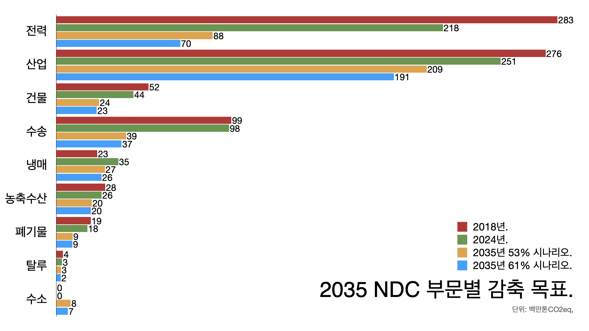 ์จ์ค๊ฐ์ค ๊ฐ์ถ ๋ชฉํ์์ ๋ถ๋ฌธ๋ณ ๋ชฉํ๋ ๊ฐ๊ฐ ๋ค๋ฆ ๋๋ค. ์๋ ๊ทธ๋ฆผ์ ๋ณด์๋ฉด ์ดํด๊ฐ ์ฌ์ธ ํ ๋ฐ์. ์ ๋ ฅ ๋ถ๋ฌธ๋ง ๋๊ณ ๋ณด๋ฉด 2018๋ ์ 2.8์ต ํค์ ๋ฐฐ์ถํ๋๋ฐ ์ง๋ํด๋ 2.2์ต ํค์ ๋๋ค. 6๋ ๋์ 0.6์ต ํค(23%)์ ์ค์์ฃ . 2035๋ 61% ์๋๋ฆฌ์ค์ 53% ์๋๋ฆฌ์ค์ ๋ง์ถ๋ ค๋ฉด ๊ฐ๊ฐ 0.9์ต ํค๊ณผ 0.7์ต ํค๊น์ง ์ค์ฌ์ผ ํฉ๋๋ค. ์ด๊ฒ ๊ฐ๊ฐ 2018๋ ๋๋น 69%์ 75%๋ค์. 2035๋ ๊น์ง ์ฐ ๊ฐ์ถ๋ฅ ์ 6.3%์ 6.9%๊ฐ ๋ฉ๋๋ค.