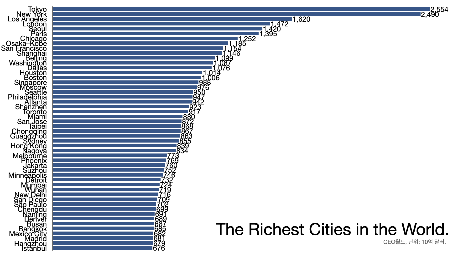 - CEO์๋ ์ง๊ณ๋ค. ์ผ๋ณธ ๋์ฟ์ ์ง์ญ GDP๋ 2.6์กฐ ๋ฌ๋ฌ, ๋ฏธ๊ตญ ๋ด์+๋ด์ ์ง๋ 2.5์กฐ๋ฌ๋ฌ, ๋ก์ค์ค์ ค๋ ์ค+๋กฑ๋น์น+์ ๋ํ์์ 1.6์กฐ ๋ฌ๋ฌ, ์๊ตญ ๋ฐ๋์ด 1.5์กฐ ๋ฌ๋ฌ, ํ๊ตญ ์์ธ์ 1.4์กฐ ๋ฌ๋ฌ๋ค.