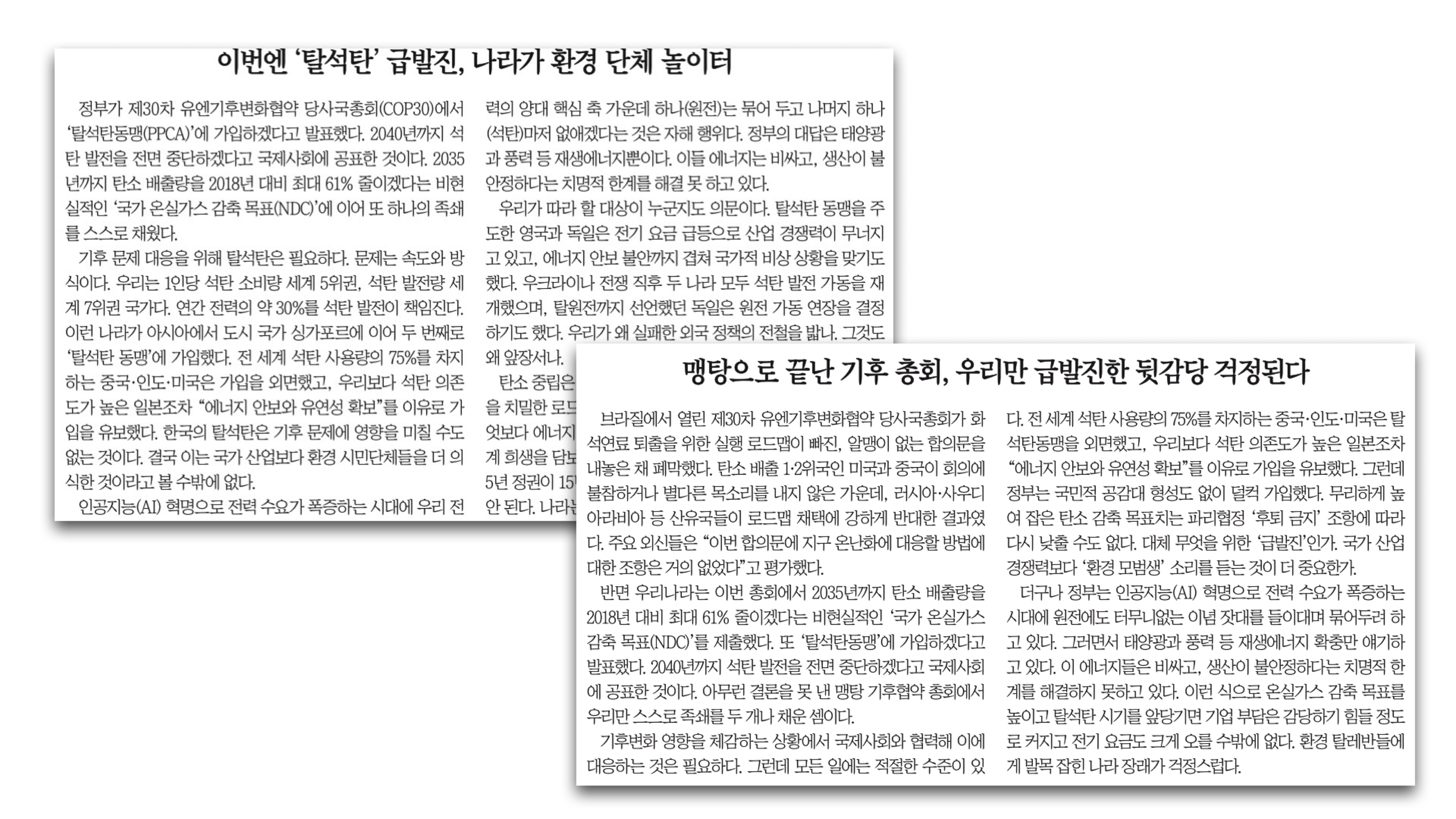 - 국가 산업보다 환경 모범생 소리를 듣는 게 중요하냐는 질문도 본질을 왜곡한다. 한국은 모범생이 아니라 열등생이다. 모범생 근처에도 못 갔다.