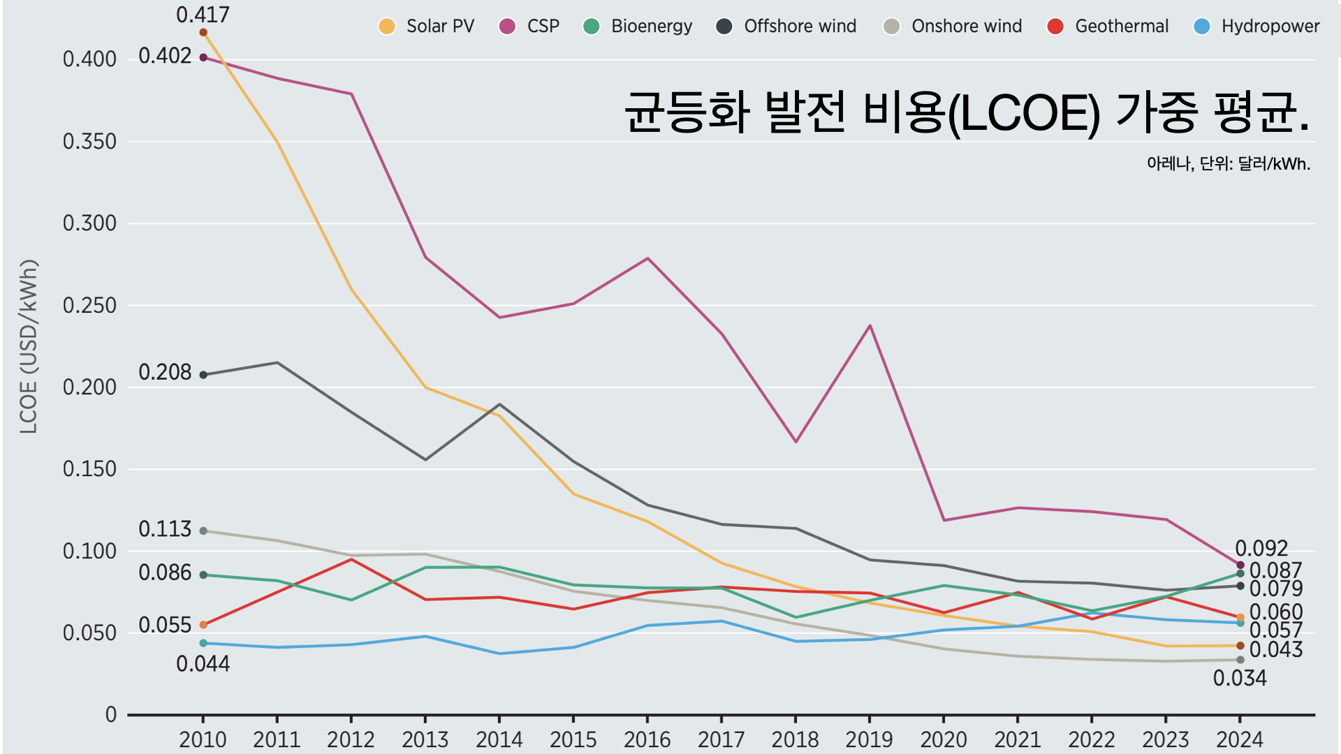 - 반면 태양광이나 풍력 발전소를 새로 지을 때 LCOE는 27~92달러/MWh 정도다.