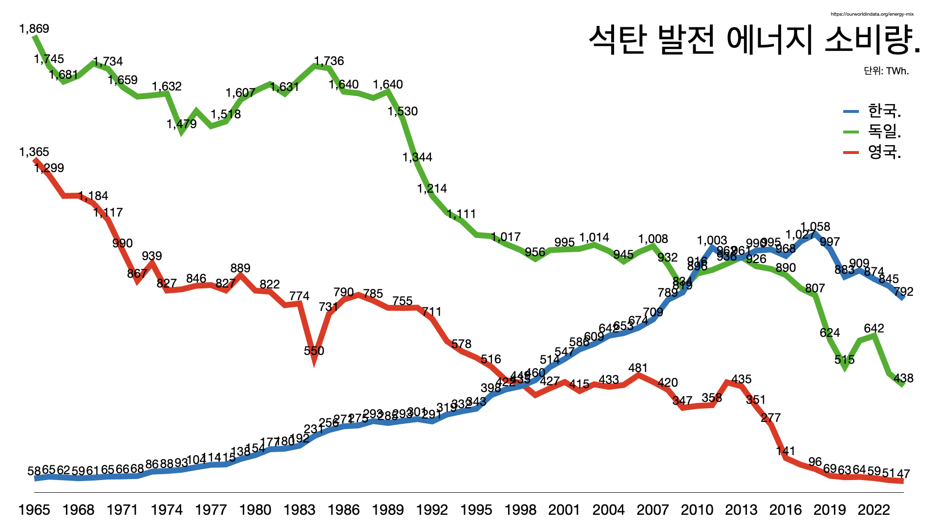- 영국과 독일은 석탄 발전을 꾸준히 줄이고 있다. 영국은 2024년 석탄 발전을 완전히 폐쇄했다.