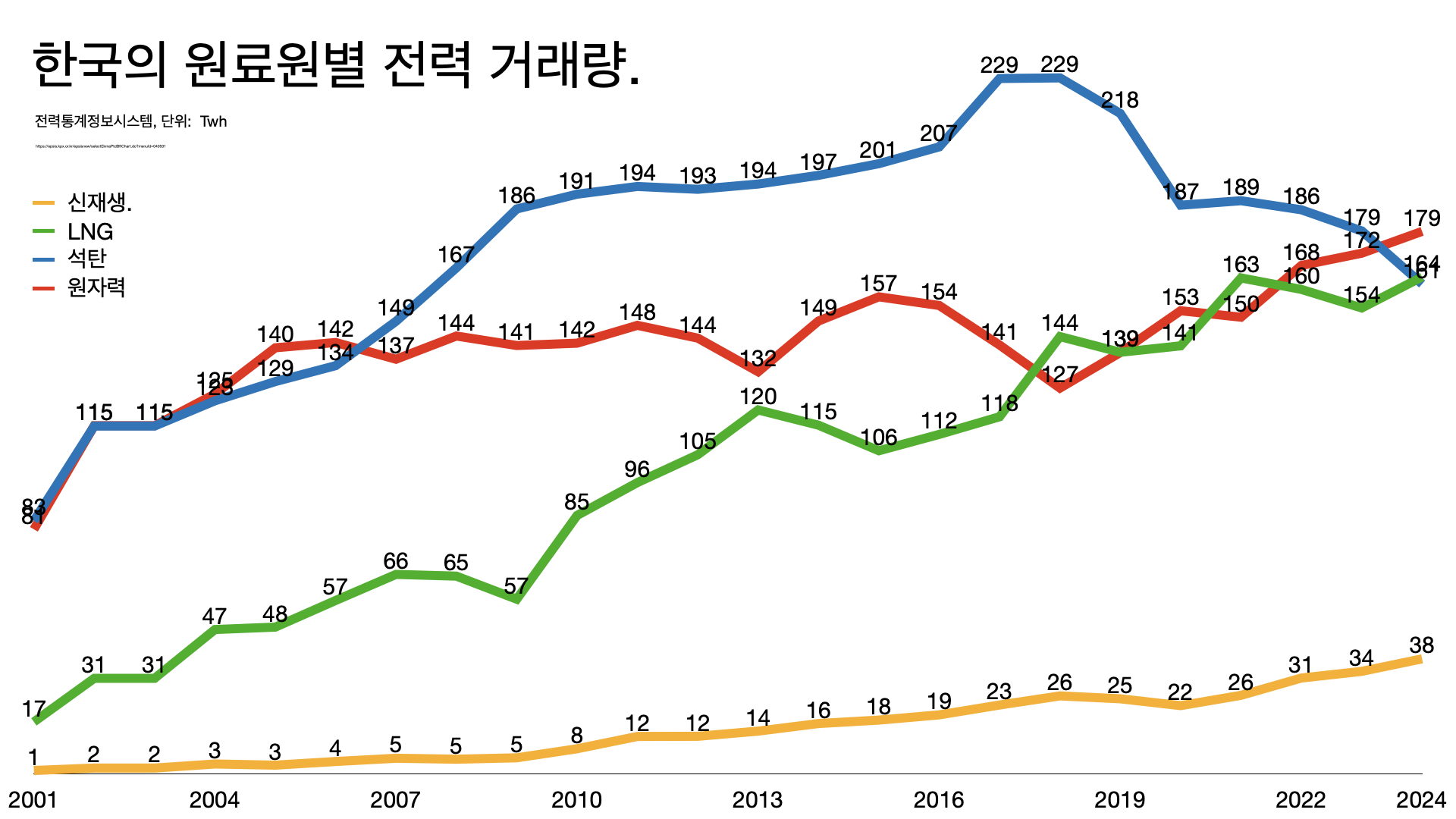 - 한국은 여전히 석탄 발전을 많이 쓰는 나라다. 2023년 기준으로 33%나 된다.