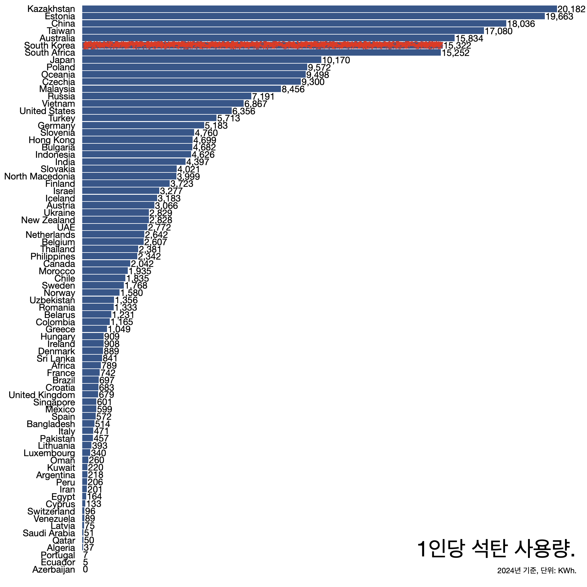- 1인당 사용량으로 따지면 카자흐스탄(2만182KWh)과 에스토니아(1만9663KWh), 중국(1만8036KWh), 대만(1만7080KWh), 호주(1만5322KWh)에 이어 6위(1만5322KWh)다.