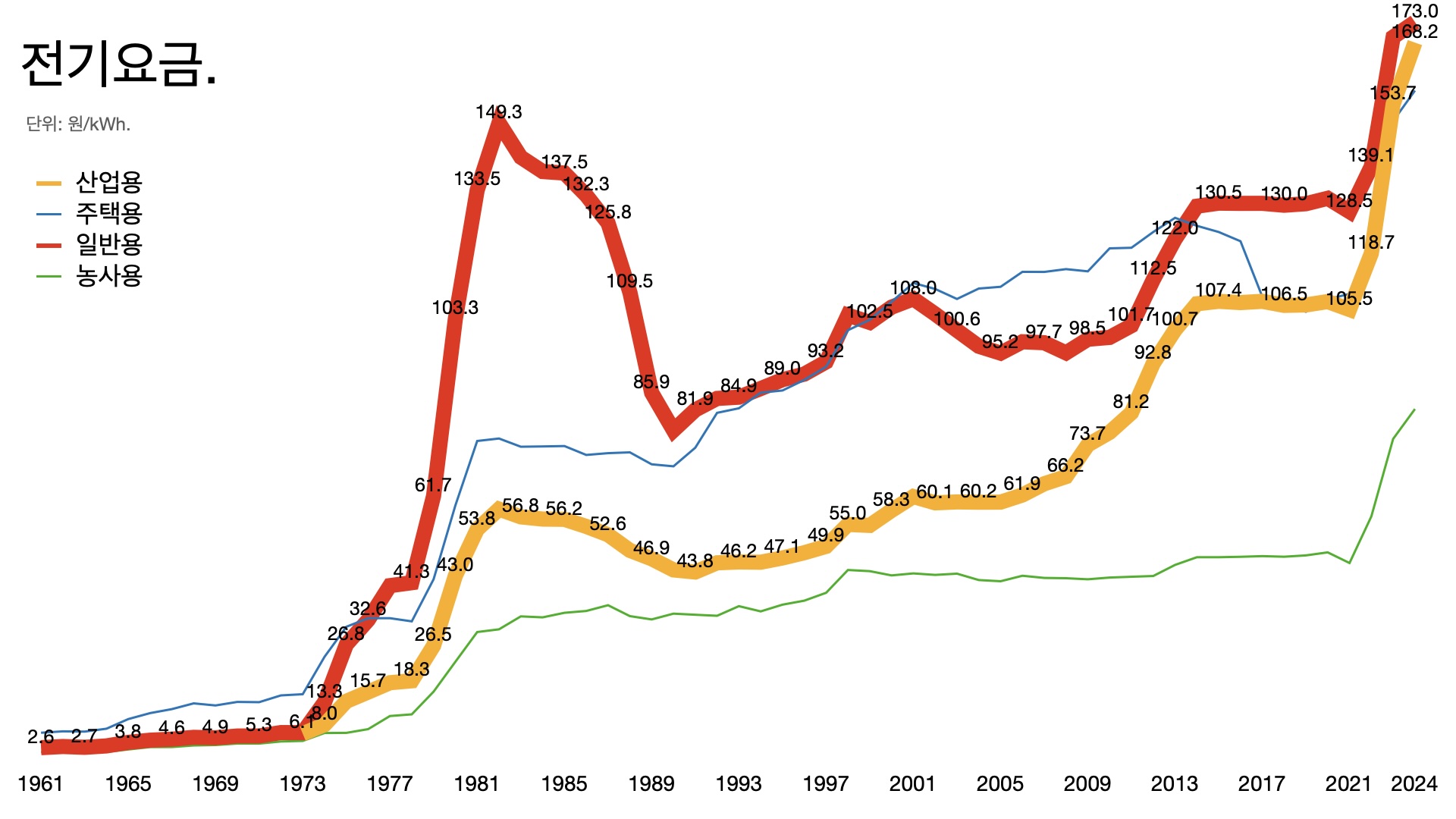 - 한국은 전기 요금이 상대적으로 싼 편이다. 가정용 전기요금이 2023년 8월 기준으로 OECD 평균은 196달러/MWh인데 한국은 107달러/MWh로 절반 수준이다.