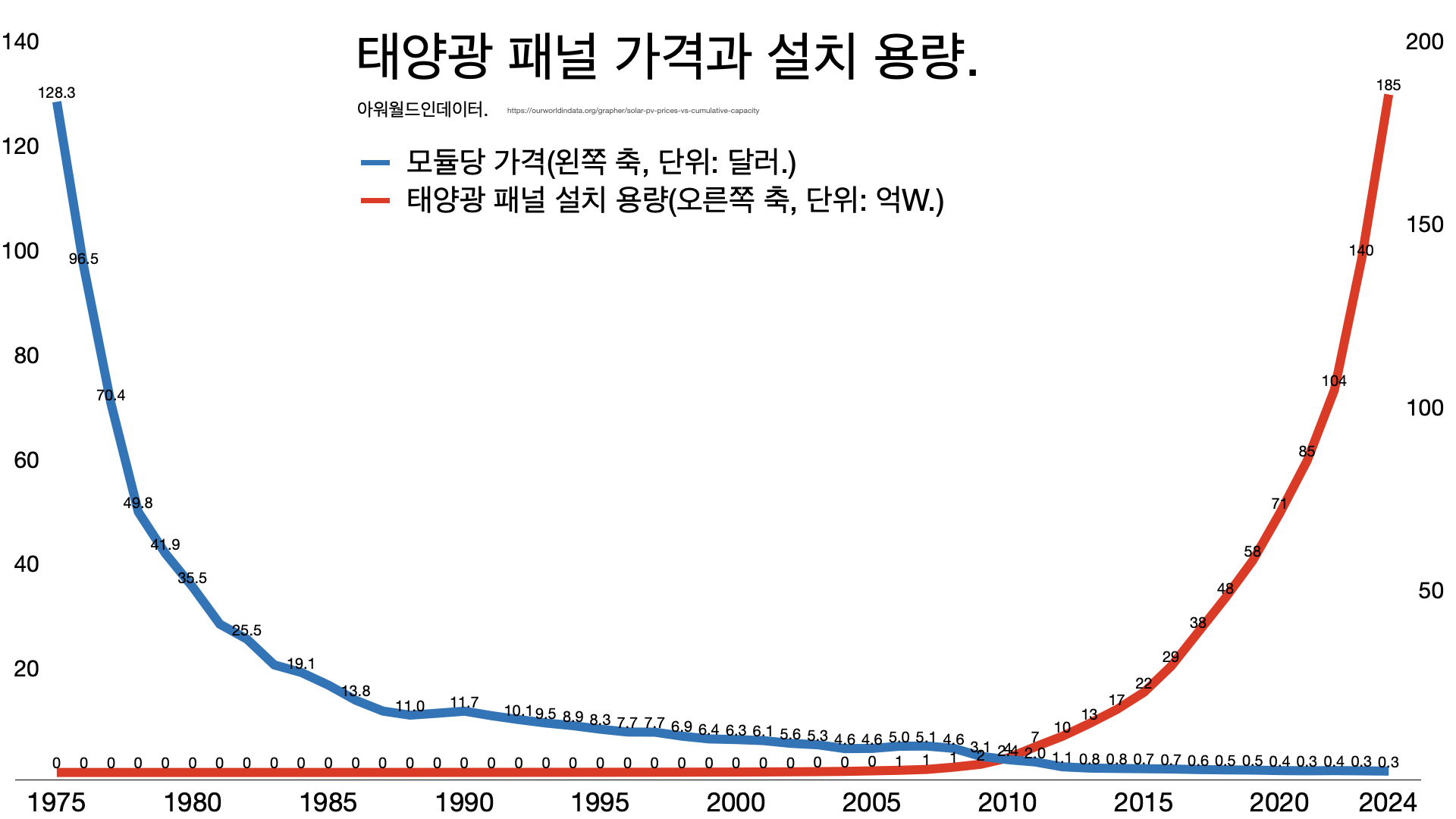 - 태양광 패널 가격은 지난 50년 동안 99.8%가 빠졌다. 대량 생산과 효율 개선의 효과다. 배터리 가격이 계속 낮아지고 있어 간헐성 문제도 상당 부분 해결됐다.