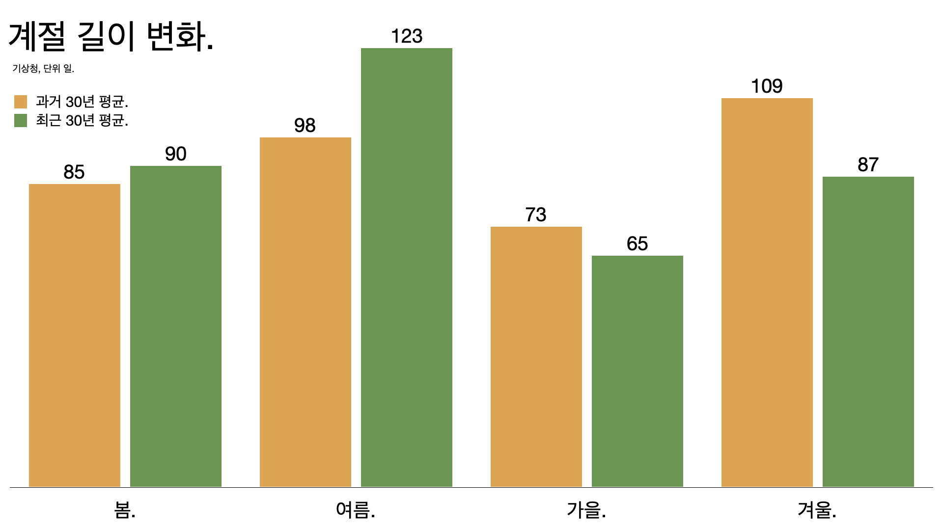 ์ฌ๋ฆ์ด 98์ผ์์ 123์ผ๋ก ๋์๊ณ ๊ฒจ์ธ์ 109์ผ์์ 87์ผ๋ก ์ค์๋ค.