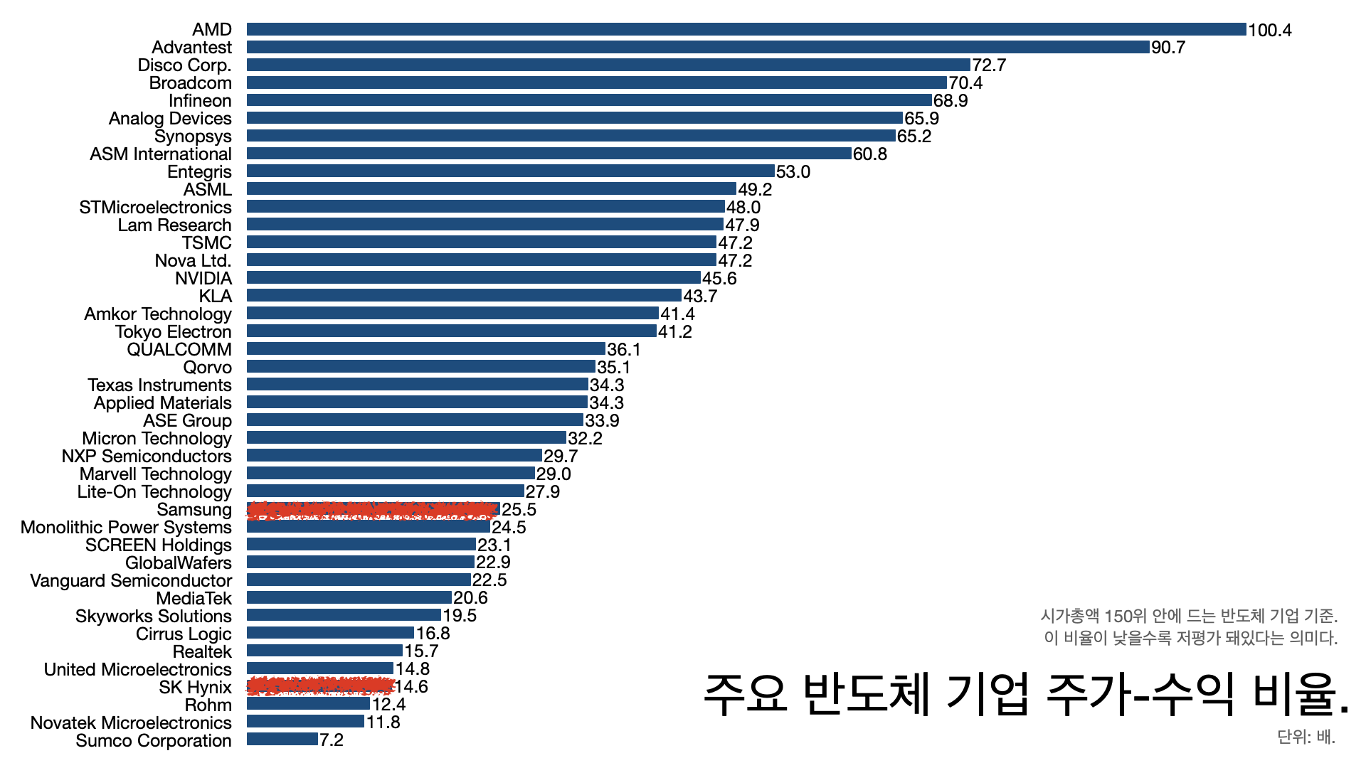 - ์ฃผ๊ฐ ์์ต๋น์จ์ด AMD๋ 100๋ฐฐ๊ฐ ๋๊ณ ๋ธ๋ก๋์ปด์ 70๋ฐฐ, ์๋น๋์๋ 46๋ฐฐ, ๋ง์ดํฌ๋ก ํ