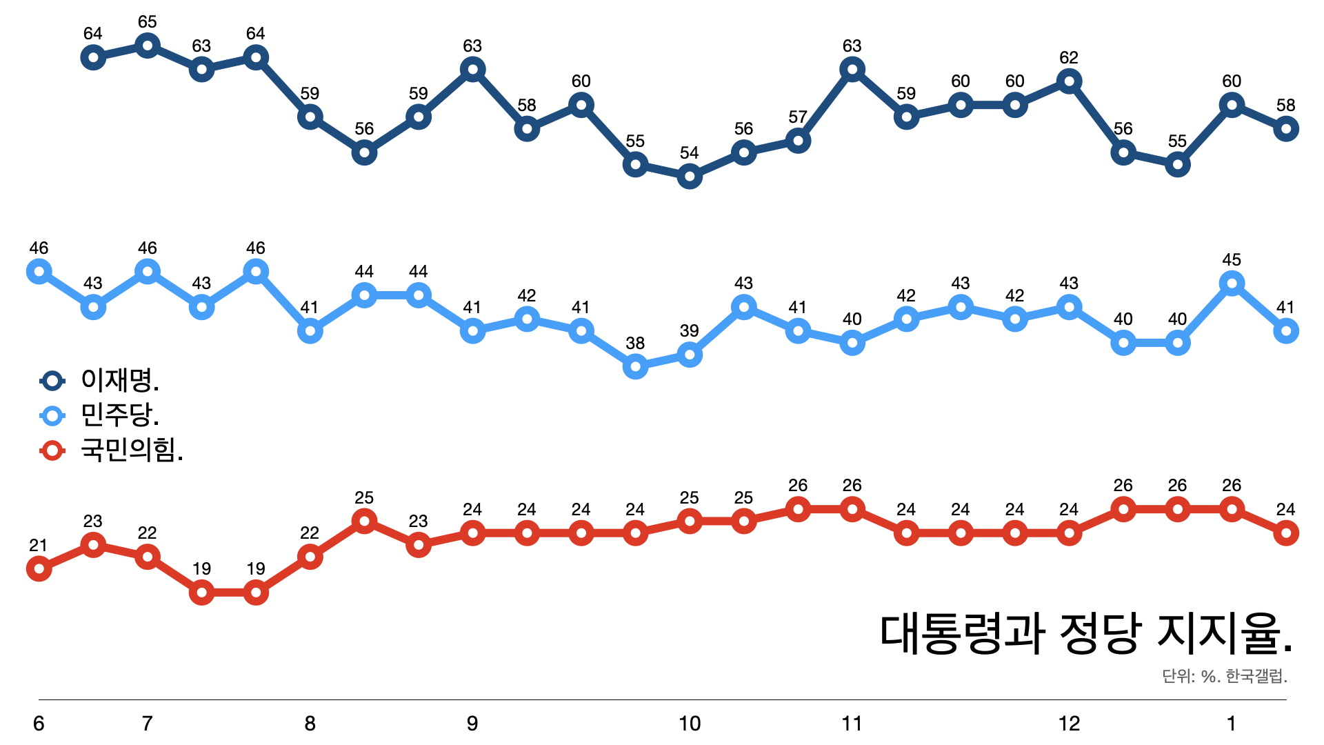 - ๋ํต๋ น ์ง์ง์จ์ 58%, ๋ฏผ์ฃผ๋น๊ณผ ๊ตญ๋ฏผ์ํ ์ง์ง์จ์ ๊ฐ๊ฐ 41%์ 24%๋ค.