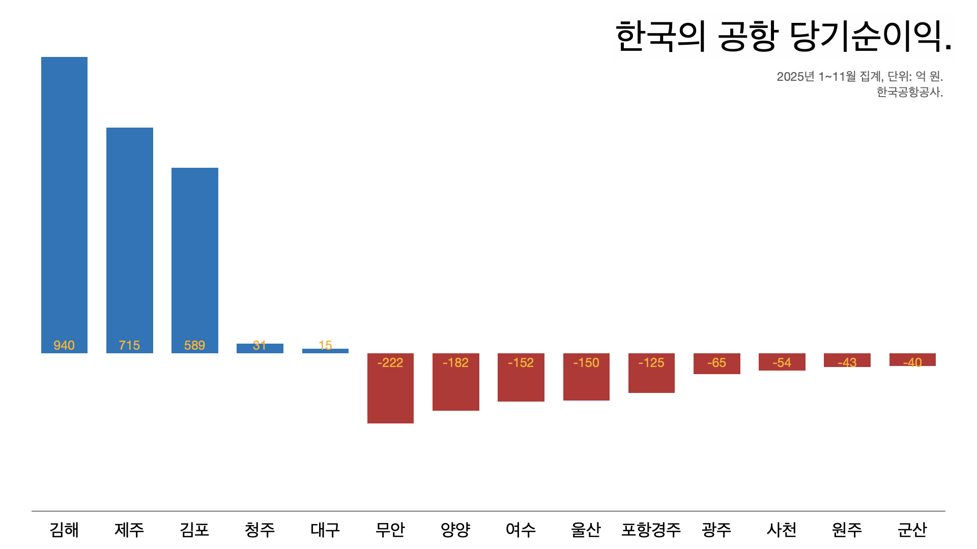 - ๊นํด๊ณตํญ๊ณผ ์ ์ฃผ๊ณตํญ, ๊นํฌ๊ณตํญ์ ๊ฐ๊ฐ 940์ต ์๊ณผ 715์ต ์, 589์ต ์์ ๋น๊ธฐ ์์ด์ต์ ๋๋ค.