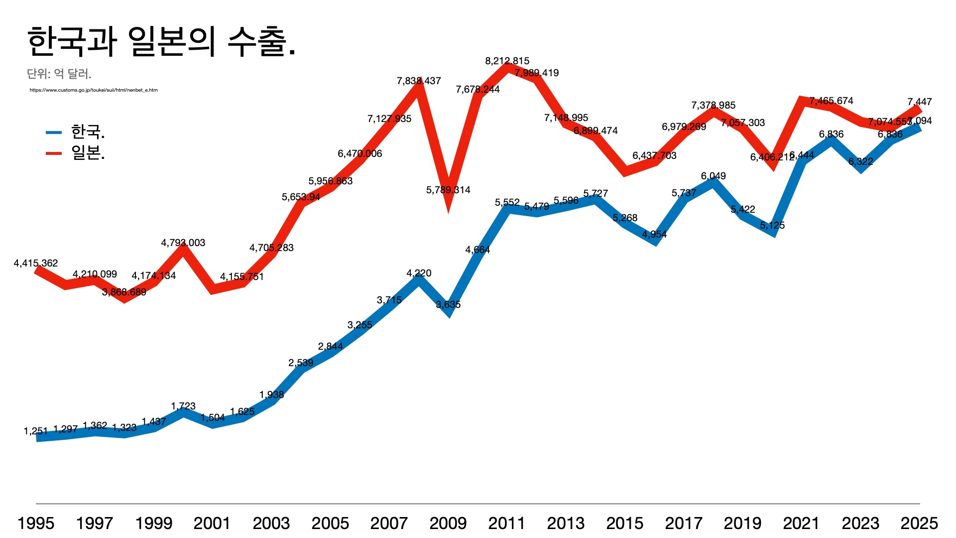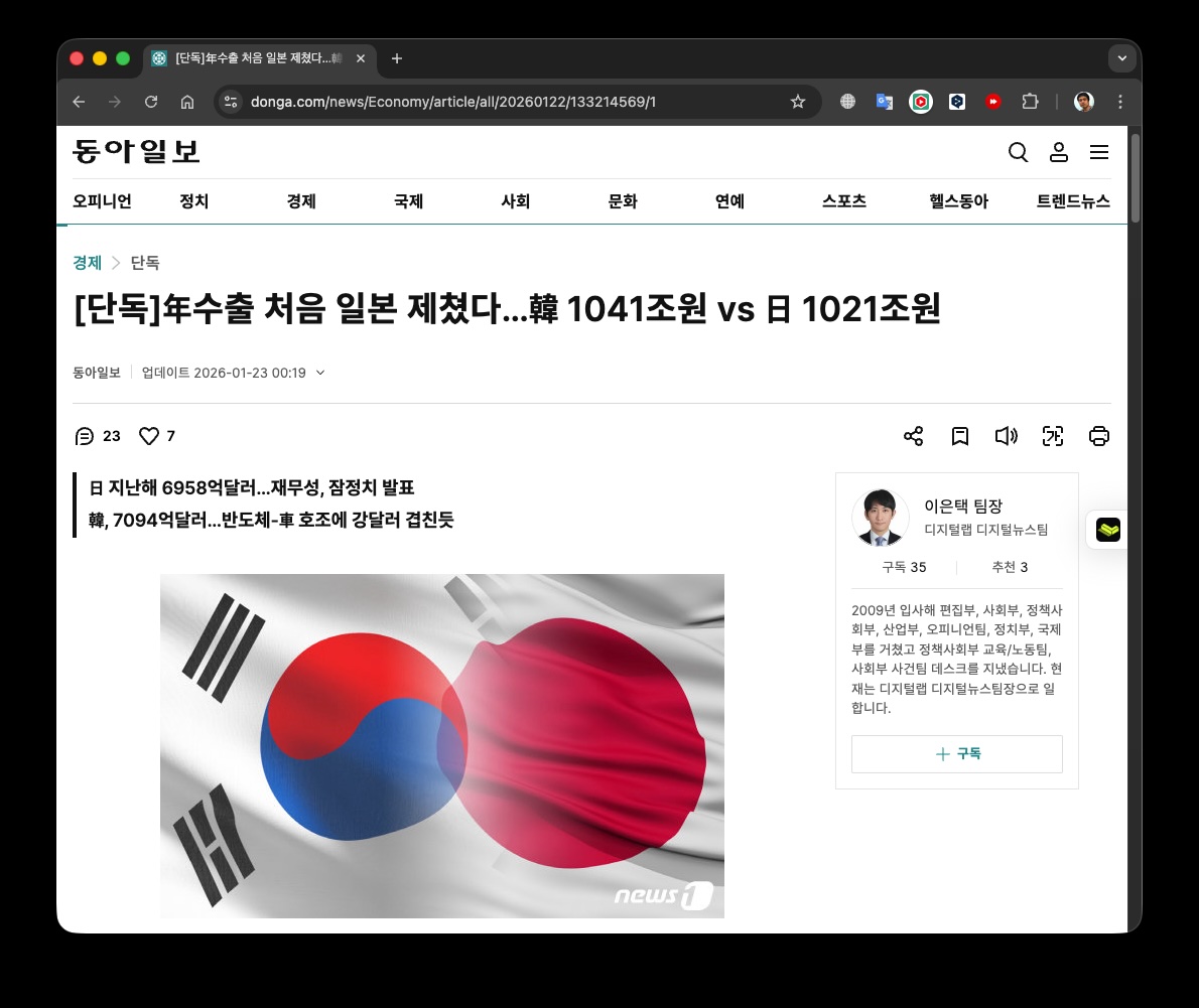 - ์ง๋ํด ํ๊ตญ ์์ถ์ด 7094์ต ๋ฌ๋ฌ์๊ณ ์ผ๋ณธ์ 110.4์กฐ ์์ด์๋๋ฐ, ๋์์ผ๋ณด๋ ๋ฌ๋ฌ๋ก ํ์ฐํ๋ฉด 6959์ต ๋ฌ๋ฌ๊ณ ๊ทธ๋์ ํ๊ตญ์ด ์ผ๋ณธ์ ๋ฐ๋ผ ์ก์๋ค๋ ๊ธฐ์ฌ๋ฅผ ๋ด๋จ๋ค.