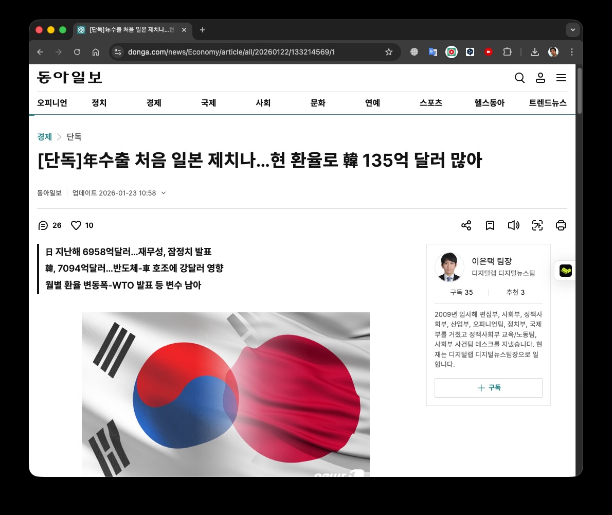 ] ์ฐ ์์ถ ์ฒ์ ์ผ๋ณธ ์ ์น๋.. ํ ํ์จ๋ก ํ๊ตญ 135์ต ๋ฌ๋ฌ ๋ง์โ๋ก ๋ฐ๋์๋๋ฐ ์ฌ์ ํ ํ์ฌ ํ์จ ๊ธฐ์ค ๋น๊ต๋ ํฐ ์๋ฏธ๊ฐ ์๋ค.