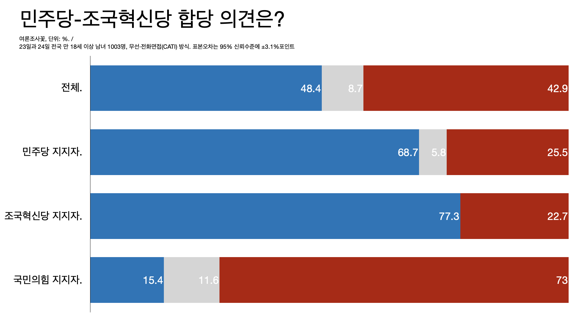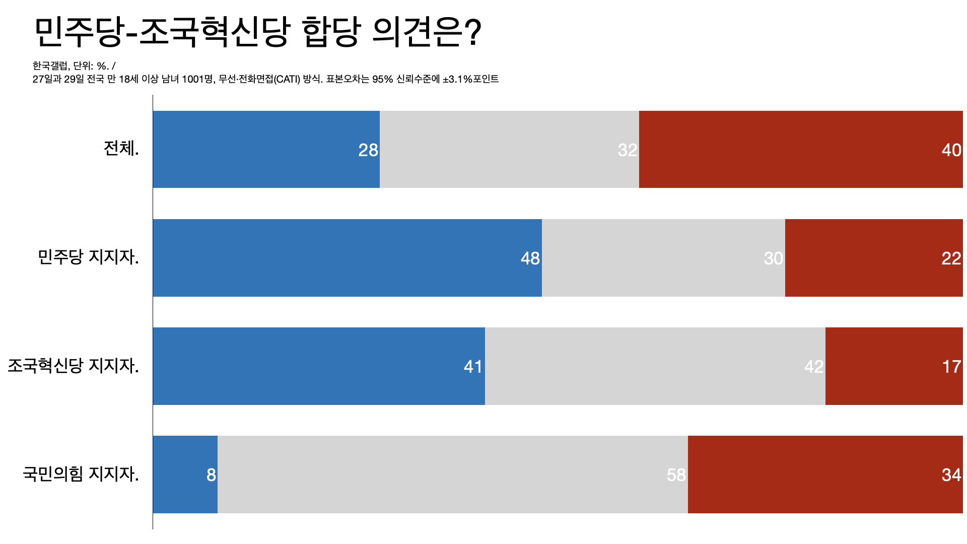 - ํ๊ตญ๊ฐค๋ฝ ์กฐ์ฌ์์๋ ๋ฏผ์ฃผ๋น ์ง์ง์์ ์กฐ๊ตญํ์ ๋น ์ง์ง์์ 48%์ 41%๊ฐ ํฉ๋น์ ์ฐฌ์ฑํ๋ค.
