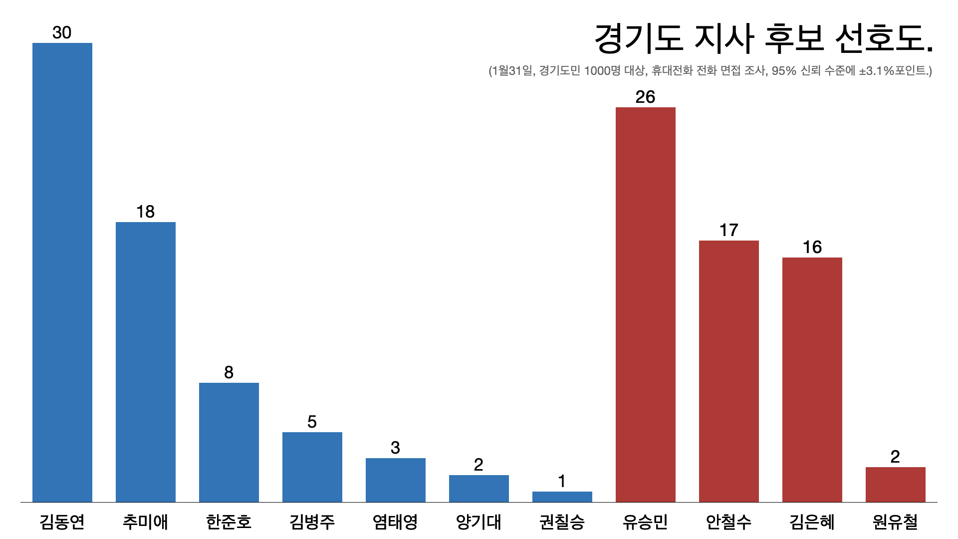 - ์ฌ์ด ๊ฒฝ๊ธฐ์ผ๋ณด-๋ฆฌ์์น์ค๋ฆฌ์์น-์กฐ์C&I ์กฐ์ฌ์์๋ ๊น๋์ฐ์ด 30%, ์ถ๋ฏธ์ ๋ 18%๋ก ๊ฒฉ์ฐจ๊ฐ ์ปธ๋ค. ๋ฏผ์ฃผ๋น ํ๋ณด๋ก ๋๊ฐ ๊ฐ์ฅ ์ ํฉํ๋ค๊ณ ๋ณด๋๋๋ ์ง๋ฌธ์ด์๋ค. (1์31์ผ, ๊ฒฝ๊ธฐ๋๋ฏผ 1000๋ช