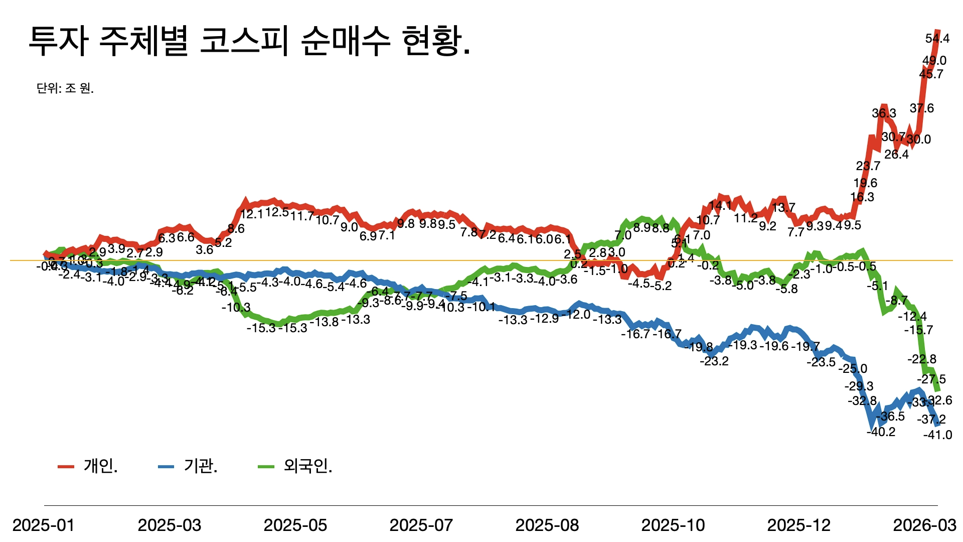 ์ฝ์คํผ 5000 ๋ํ ์ดํ ์ธ๊ตญ์ธ๊ณผ ๊ธฐ๊ด์ ๊พธ์คํ ์ฐจ์ต์ ์คํํ ๋ฐ๋ฉด ๊ฐ์ธ ์ ์ ์ด ํฌ๊ฒ ๋์๋ค. ๊ฐ์ธ์ ๋์ ์๋งค์ ๊ท๋ชจ๋ 54์กฐ ์์ ์ด๋ฅธ๋ค. ์ธ๊ตญ์ธ๊ณผ ๊ธฐ๊ด์ ๊ฐ๊ฐ 28์กฐ ์๊ณผ 41์กฐ ์์ ์๋งค๋ ํ๋ค.