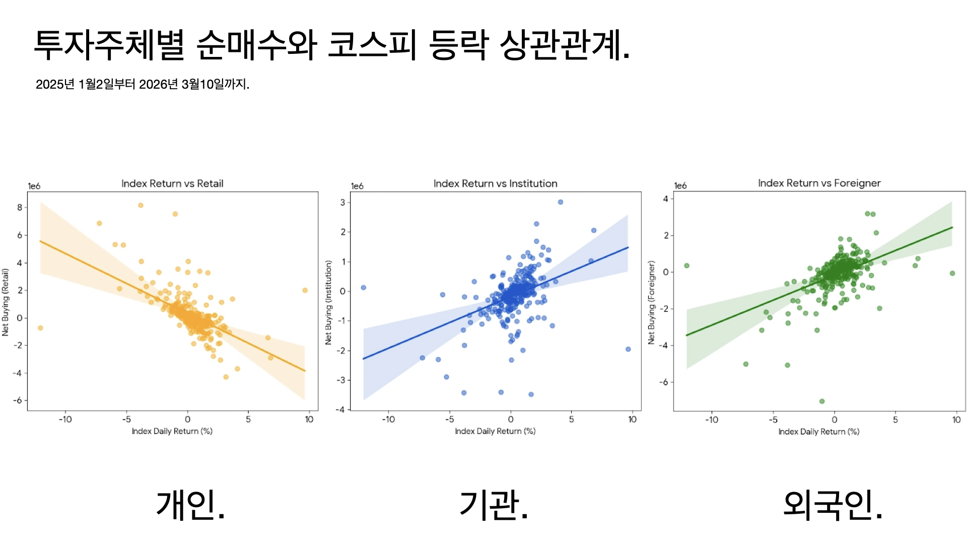 ์ง๋ํด 1์๋ถํฐ ์ฝ์คํผ ์ง์์ ์๋งค์ ๊ท๋ชจ์ ์๊ด๊ด๊ณ๋ฅผ ๋ณด๋ฉด ๊ฐ์ธ ํฌ์์๋ ์๊ด๊ณ์๊ฐ -0.57์ด๊ณ ์ธ๊ตญ์ธ๊ณผ ๊ธฐ๊ด์ 0.50์ 0.41์๋ค. ๊ฐ์ธ์ด ์ฌ๋ ๋ ๋จ์ด์ง๊ณ ๊ฐ์ธ์ด ํ๋ ๋ ์ค๋ฅธ๋ค. ๊ฑฐ๋๋์ ๊ฐ์ธ์ด 50~70%๋ฅผ ์ฐจ์งํ์ง๋ง ์์ฅ์ ํ๋ฆ์ ์ธ๊ตญ์ธ์ด ๊ฒฐ์ ํ๋ค.